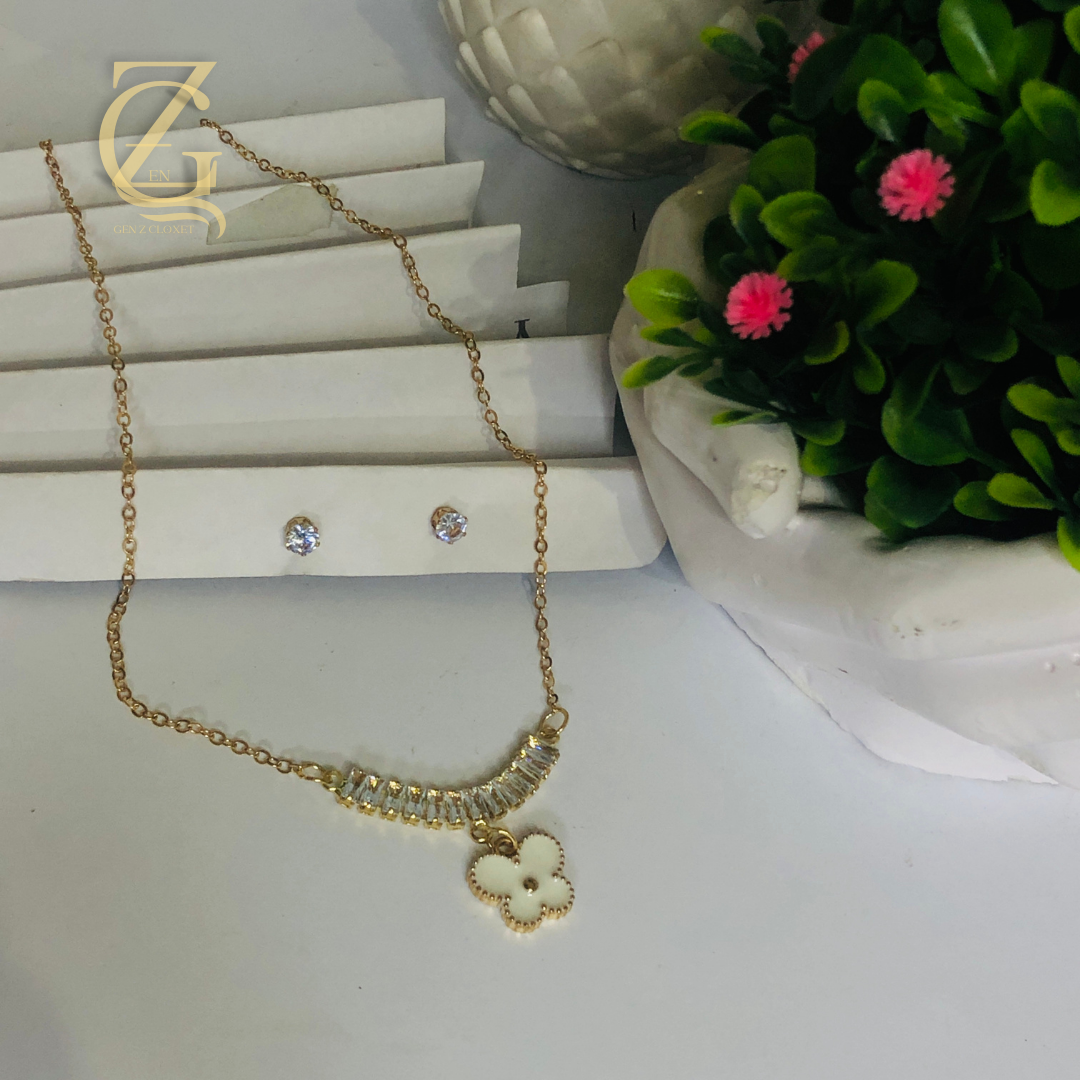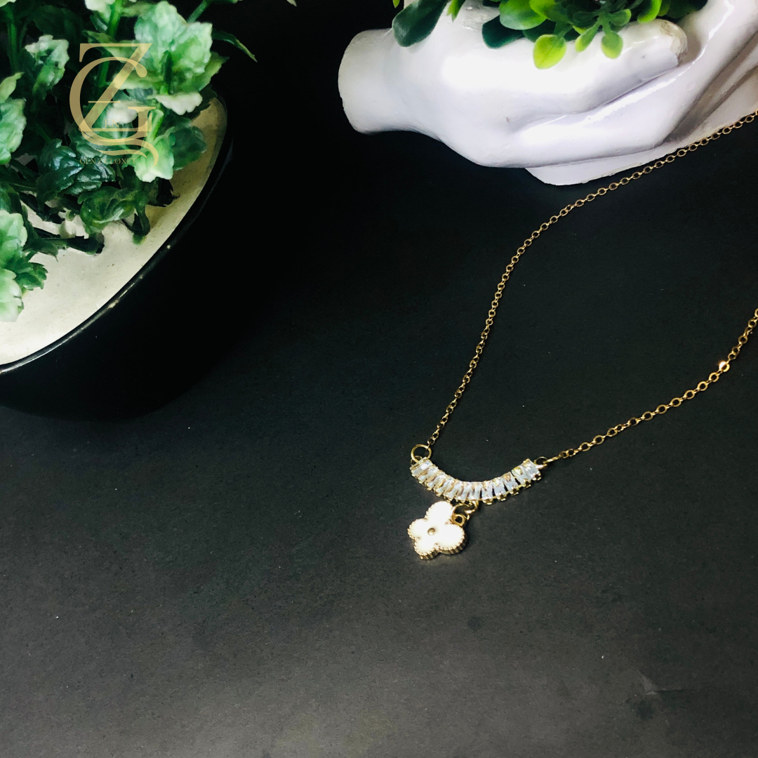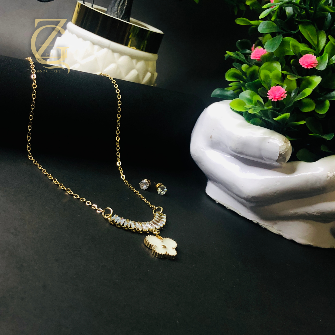 Elegant white shell clover necklace with baguette crystal detailing. Lightweight, premium finish, and luxury look at an affordable price by Gen Z Cloxet.