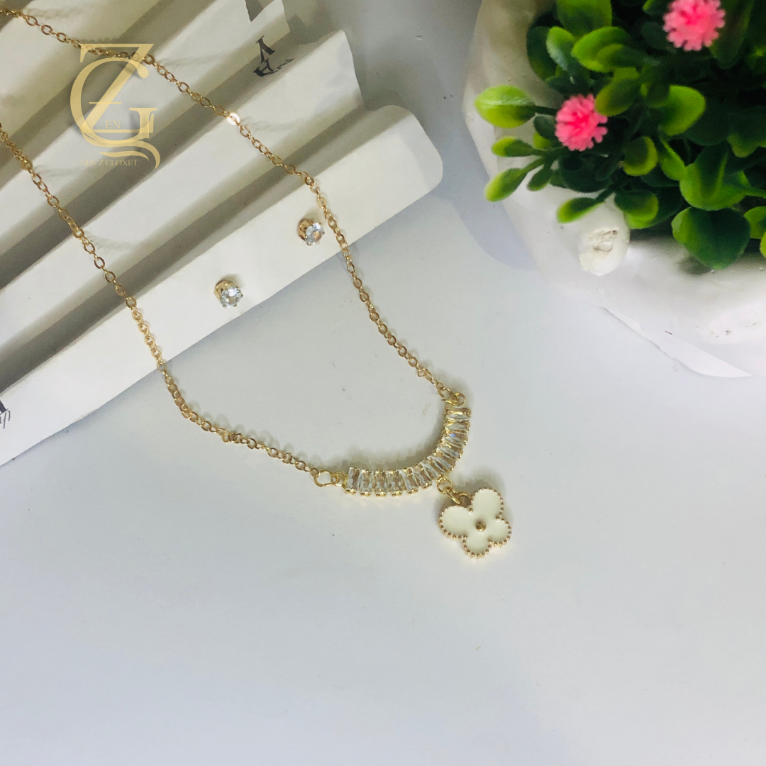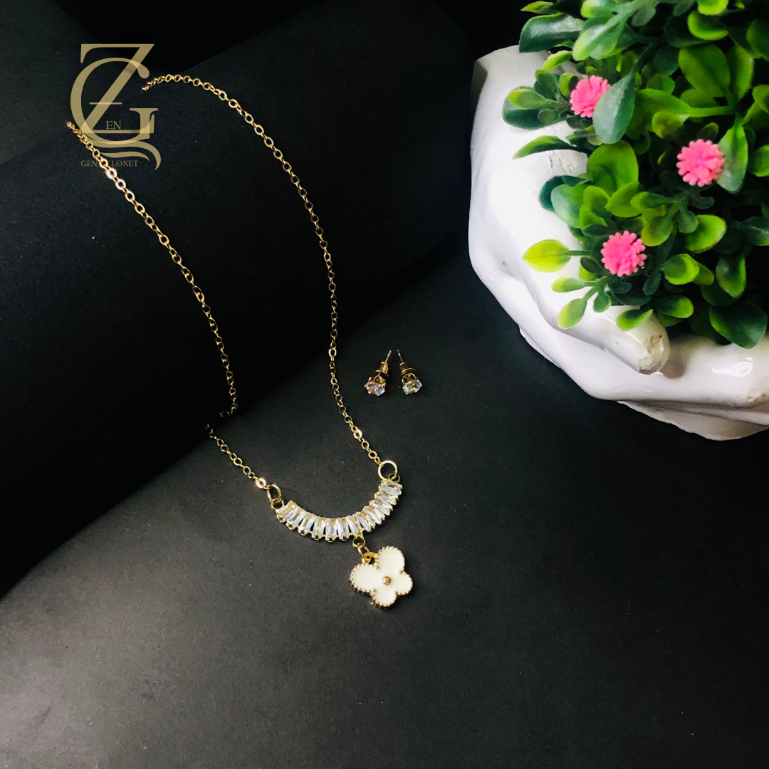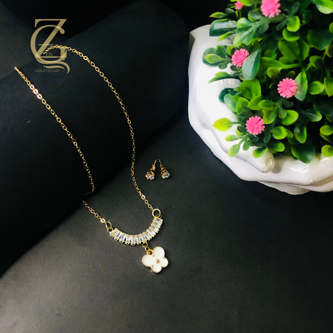 Elegant white shell clover necklace with baguette crystal detailing. Lightweight, premium finish, and luxury look at an affordable price by Gen Z Cloxet.